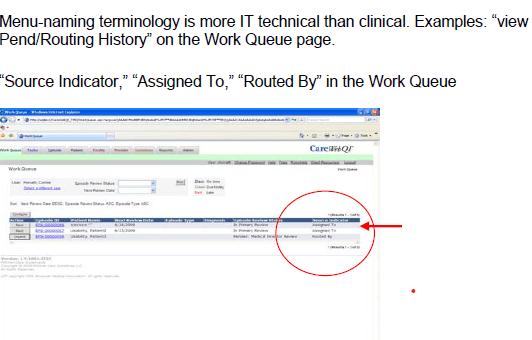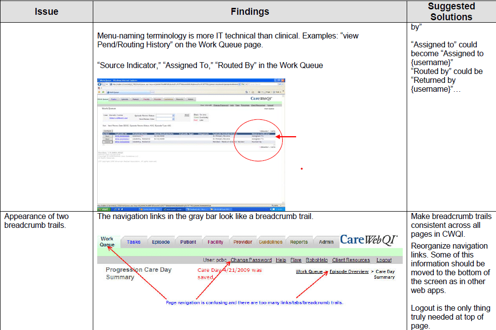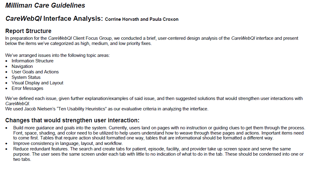 - In April/May 2009, I was tasked with conducting a content evaluation (along with the Product Manager) of the entire CareWebQI interface, using expert heuristic usability assessments and criteria.